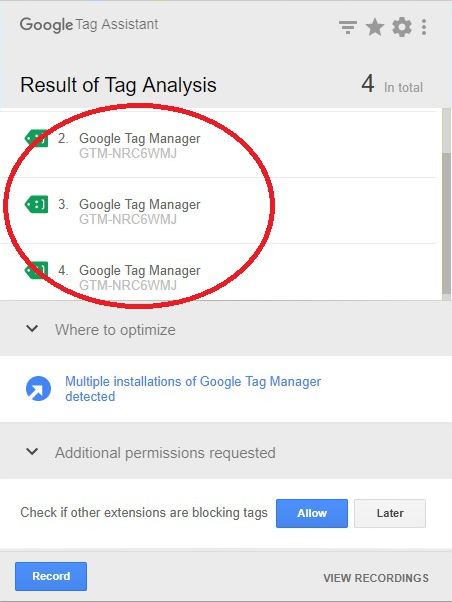 Nonostante sul sito sia implementato un solo snippet di Google Tag Manager, può capitare che la nota estensione per Chrome, Google Tag Assistant, utile per verificare di aver installato correttamente i vari tag Google nelle pagine del sito, mostri più di un istanza dello stesso codice del GTM seguita dal messaggio “Multiple installation of Google Tag Manager detected“, Fig. 1.